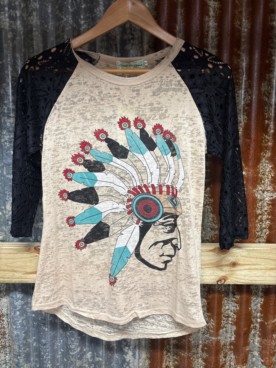 Women's Native American Burnout Shirt with Black Lace Sleeves