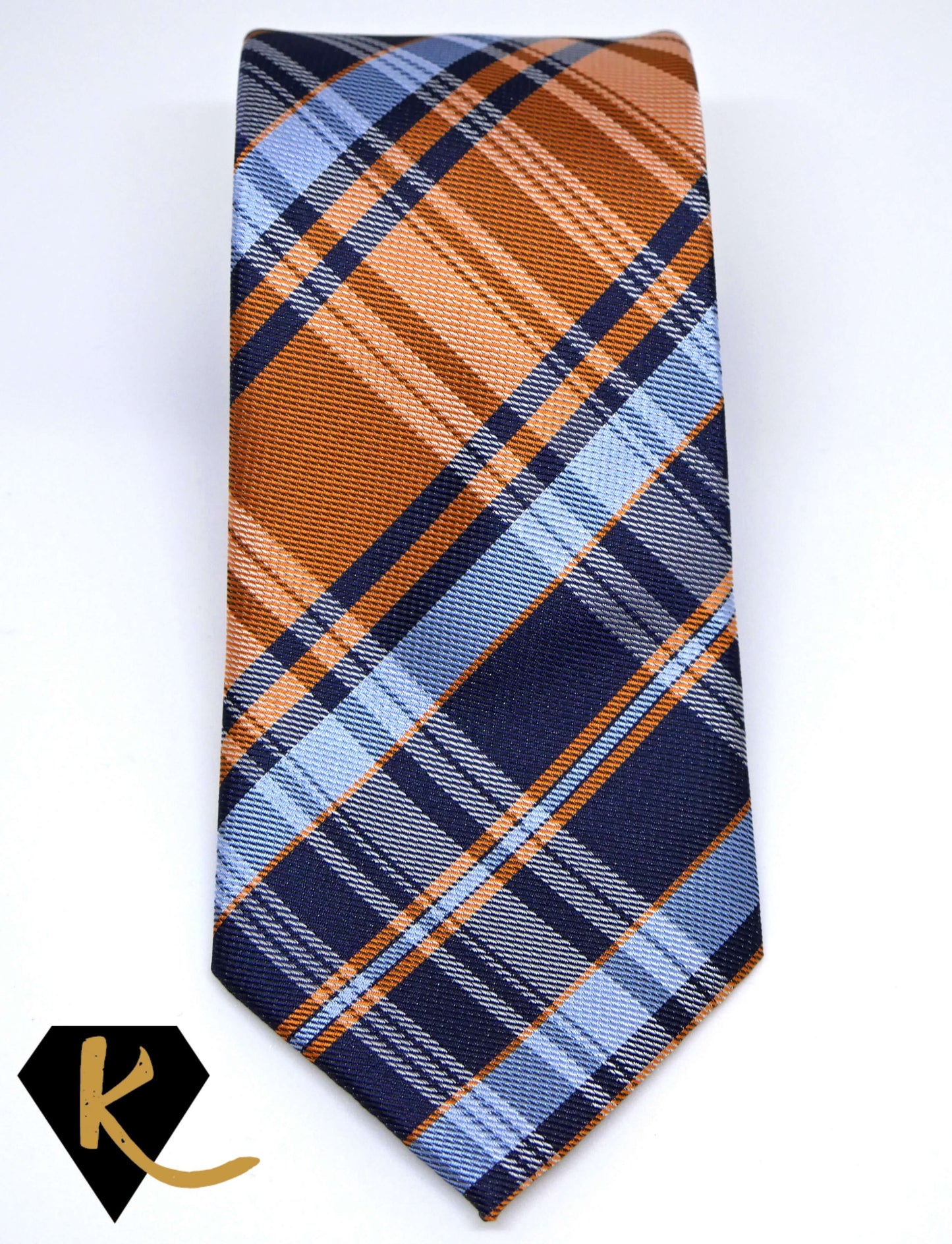 Men's Navy Blue and Orange Plaid Necktie