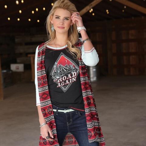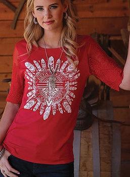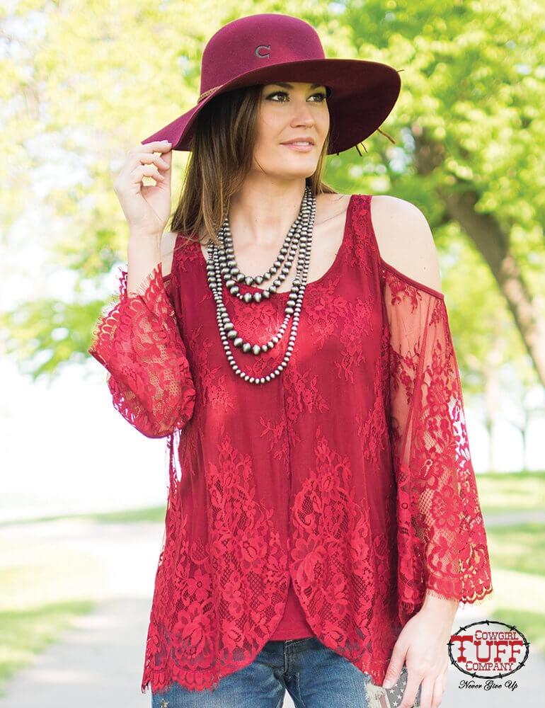 Women's Cowgirl Tuff Red Lace Cold Shoulder Shirt